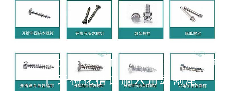 主要分類包括普通螺絲、機(jī)螺絲、自攻螺絲和膨脹螺絲三種。有頭螺釘Cap screw 過(guò)去限于全牙的扣件。六角頭螺釘Hex cap screw與大六角螺栓Hex bolt 顧名思義為頭部為六角型的外螺紋扣件,設(shè)計(jì)為使用扳手轉(zhuǎn)動(dòng)。依照ASME B18.2. Phill 十字槽Serra-tion 墊下帶花Flower Head 開(kāi)花頭6-bobes recess 內(nèi)梅花Piston bolt 活塞螺釘Winding bolt 線圈螺釘Hexagon head bolts-full thread 六角頭螺栓 全螺紋Carriage bolt 馬車螺栓Square head bolt-product grade C 方頭