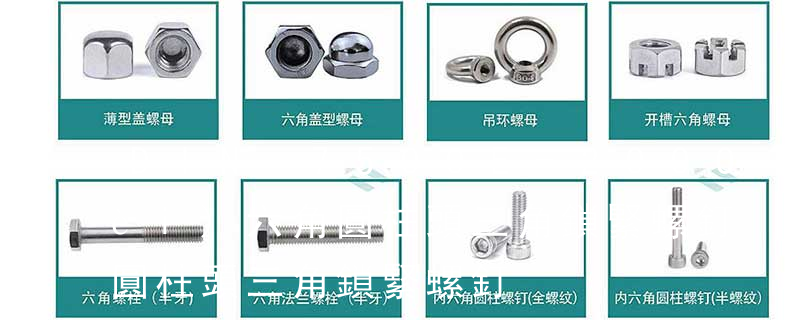 最常見的是六角頭螺栓 國(guó)標(biāo)GB5783 GB5782 德標(biāo)Din933 Din931 (8.8級(jí)粗牙外六角螺栓)圓柱頭內(nèi)六角螺釘 國(guó)標(biāo)GB70.1 德標(biāo)Din912 還有很多像什么盤頭十字螺釘 沉頭十字螺釘 開槽盤頭螺釘 開槽沉頭螺釘?shù)鹊群芏喾N。 開槽滾花高頭螺釘 Slotted knurled thumb screws with collar 滾花高螺母 Knurled thumb nuts with collar 滾花薄螺母 Knurled thumb thin nuts 鎖緊墊圈 Sealing washers 軸用彈性墊圈 Retaining rings for shafts(external),