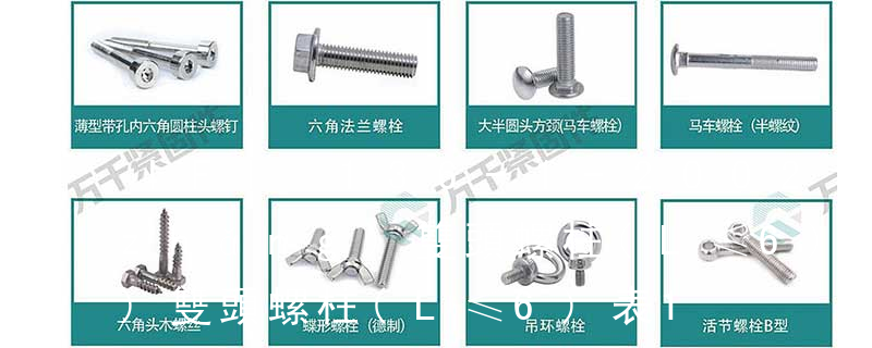 標(biāo)準(zhǔn)件螺絲規(guī)格種類1、螺栓(1)六角頭螺栓:規(guī)格d=M5~M36,L=8~300mm。(2)半圓頭方頸螺栓:規(guī)格d=M6~M16,L=30~160mm。(3)高強(qiáng)度大六角螺栓:規(guī)格d=M12~M24,L=35~240mm。2、螺柱雙頭螺柱和等長(zhǎng)雙頭