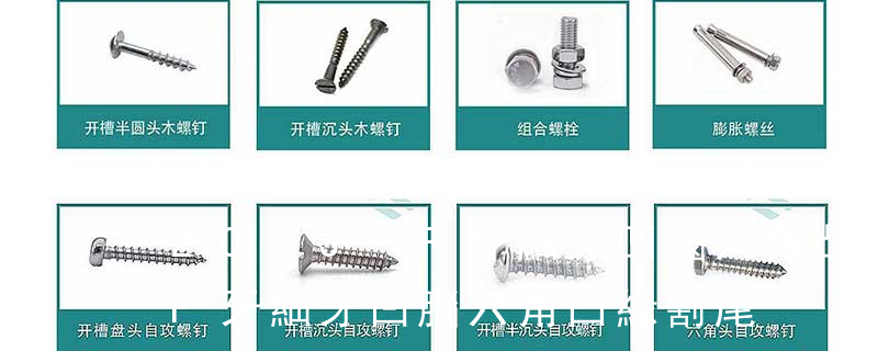 (鐵板牙自攻螺絲) B-2: Plastic Tapping Screw. (塑膠用,自攻螺絲) C: Wooden Screw : 木工螺絲 D: Drywall Screw :水泥墻螺絲 E: Self Drilling Screws鉆尾螺絲(不銹鋼鉆尾螺絲,復合材料鉆尾螺絲) F:膨脹螺絲,四片膨脹螺絲又