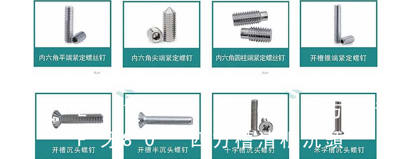 1.機(jī)螺釘 2.自攻螺釘 3.鉆尾螺釘 4.墻板釘 5.纖維板釘 6.木螺釘7.六角木螺釘 8.不脫出螺釘 9.組合螺釘 10.微型螺釘 11.家具螺釘 12.電子螺釘頭型:1.六角頭(hexagon head) 2.六角頭法蘭面(hexagon head with flange) 3. (鐵板牙自攻螺絲) B-2: Plastic Tapping Screw. (塑膠用,自攻螺絲) C: Wooden Screw : 木工螺絲 D: Drywall Screw :水泥墻螺絲 E: Self Drilling Screws鉆尾螺絲(不銹鋼鉆尾螺絲,復(fù)合材料鉆尾螺絲) F:膨脹螺絲,四片膨脹螺絲又